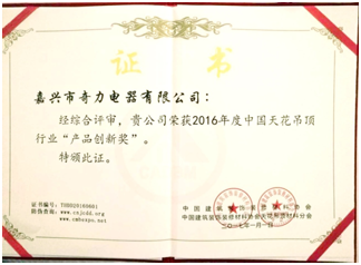 嘉興市奇力電器有限公司做為吊頂行業(yè)公認(rèn)的“十大品牌”和中國(guó)建筑裝飾裝修材料協(xié)會(huì)天花吊頂材料分會(huì)常務(wù)副會(huì)長(zhǎng)單位,應(yīng)邀參加了這次盛會(huì)。公司憑借優(yōu)異的研發(fā)團(tuán)隊(duì)和在吊頂產(chǎn)品創(chuàng)新中取得的不俗成績(jī),榮獲2016年度中國(guó)天花吊頂行業(yè)“產(chǎn)品創(chuàng)新獎(jiǎng)”。