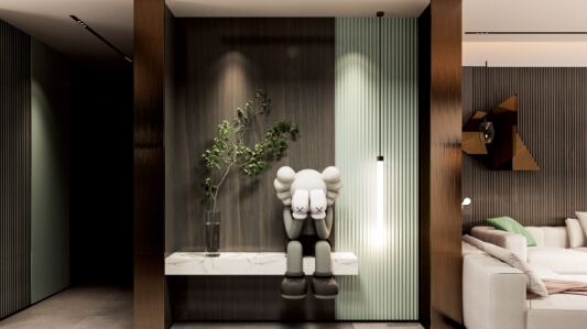 黑色波浪板在巖紋板與木紋板之間時尚過渡,這樣搭配出來的沙發背景墻,既擁有肌理的細節,還給空間帶來了層次感與節奏感。